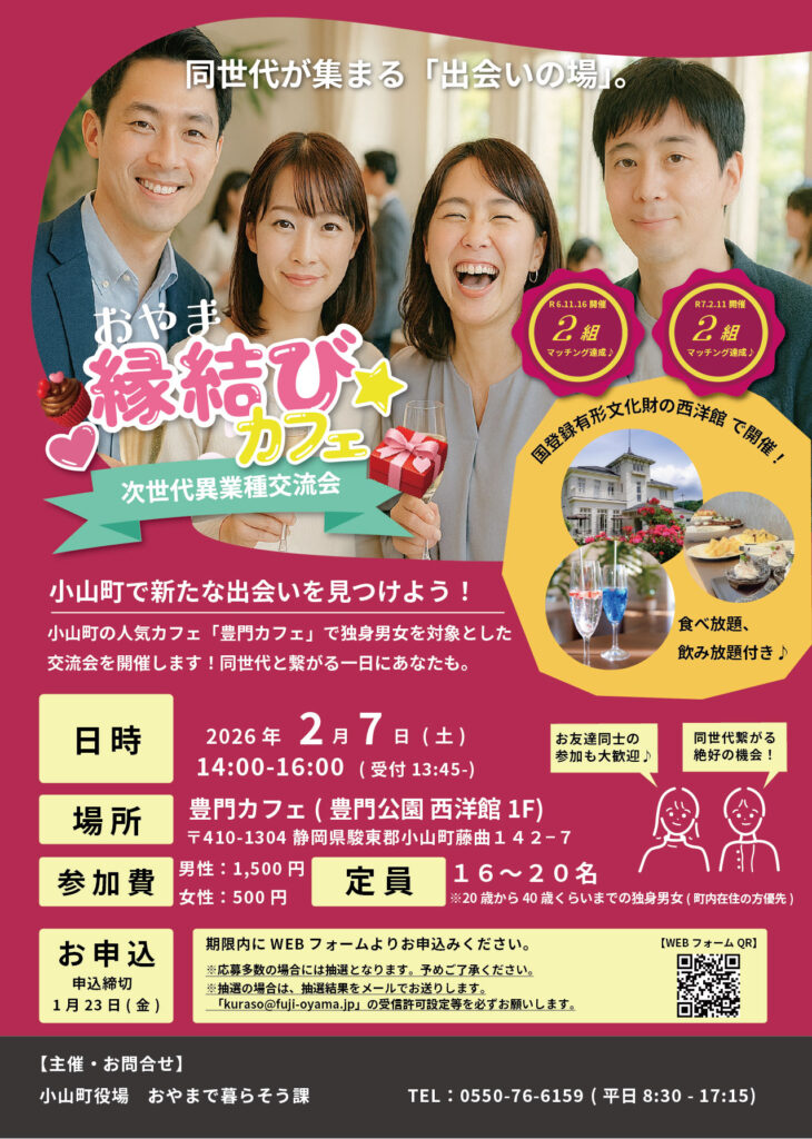 小山町の次世代を担う独身男女を対象とした次世代異業種交流イベント「おやま縁結びカフェ」を2月7(土)に開催いたします!